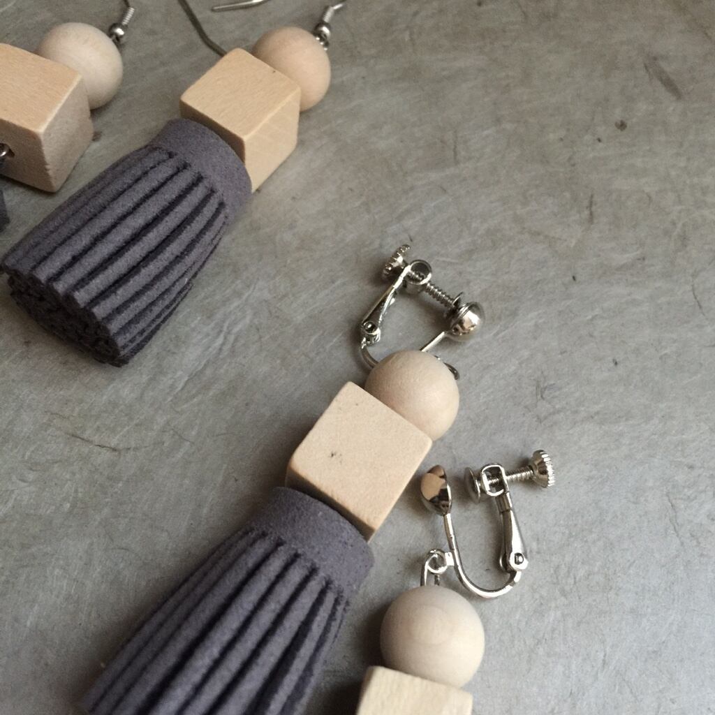【ピアス / イヤリング】ウッド&スエード調タッセル グレー
